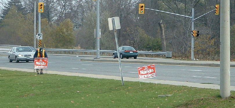 Just before noon on Nov. 9, 2006, two men in a shiny white pick-up stopped on the Queensway just before Hurontario street, took pictures of the sign locations and removed about 10 (that lined the street), of Councillor Nando Iannicca's election sign! Likely City staff but how often do we catch them in the act of removing a Councillor's election signs? Home Page - Main Table of Contents - Back up a page - Back to Top