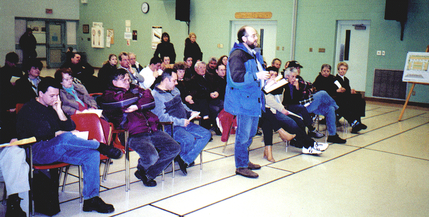 City meeting at the Mississauga Senior's Centre To lay the foundation for the elimination of the Northmount community and the Cawthra Bush by the Queen of Urban Sprawl her self - Hazel McCallion None-the-less, the meeting was set-up to not encourage public participation or input. The table that the City and Moldenhauer Development sat at was a good 20 feet back from where the taxpayers chairs were set-up. This gave the feeling that a wall or barrier (or maybe a moat), existed between the community and these who redevelop it. There was no mike for the taxpayers to use, just for those at the table. This forced those who were already upset, to yell just to be heard, not a smart move. I have been to meetings in the Senior's Olga Tyne Auditorium before and mikes were set up for the public to use, in fact the speakers for the sound system can be seen mounted on the wall in some pictures. It is no wonder there were repeated calls that the City was not listening to us. The City notice for the Feb. 4th, meeting was dated Jan. 21st, exactly two weeks before the meeting. 2 weeks notice is considered to be the bare minimum for public notices and would only have arrived on time if they were delivered that day, they were mailed the next day. I received mine Jan. 26. Remember the City agreed to another meeting on Jan. 12th. and just how long does the City need to set up a public meeting in one of its own halls? The City has time and time again given residents late notices, it is more the rule then the exception, especially when it does not want public input. It was noted earlier on that the City notice for this meeting sounded some what threatening in the way it said "Please be advised that Mayor McCallion is planning on attending this meeting." and from the way she acted at the meeting, I was right. Read on. A word about the notices we sent out to hundreds of local homeowners, much thanks to Paul Szabo, Mississauga South M.P., for his assistance. They were mailed Jan. 26th, (Tues.), but many were post marked Feb. 3! As few had arrived by Monday (Feb. 2), calls were made to Canadian Post and the situation was explained and we were ensured they searched every where to make sure no boxes of mail were laying around undelivered. However, some even arrived just before the Feb. 10th, meeting! I suspect that, what happened was when someone saw the hundreds of letters, that someone thought it would be a bit too much to delivery them all right away and then did only a few a day. The winter weather was bad and there was a blizzard when the letters were delivered directly to the Post Office, all neatly packed into 2 boxes. In addition to that mailing I rode around the community on my bike delivering to many other homes and mailed to 68 other homes. About 1,000 notices were delivered. Mr. Szabo M.P., was true to his word and came to address the issues and was very poorly treated by the Mayor. Even Mr. King felt so. Mr. Szabo and the taxpayers were calling for this matter to be reconsidered due to the extremely negatively impacts of this townhouse subdivision and those that would follow. Mr. Szabo stood up for us in the name of fairness, when other elected representatives would not. Two member of the Green Party also came and spoke on our behalf.